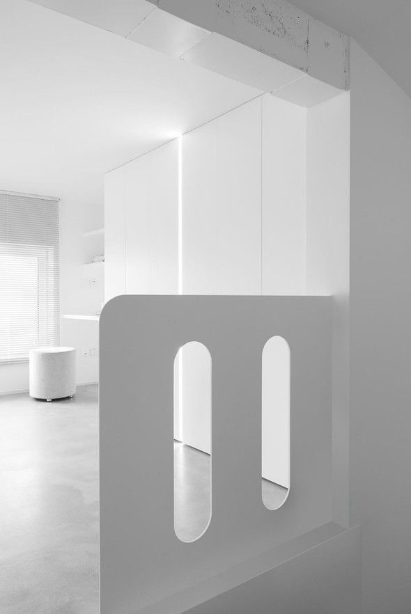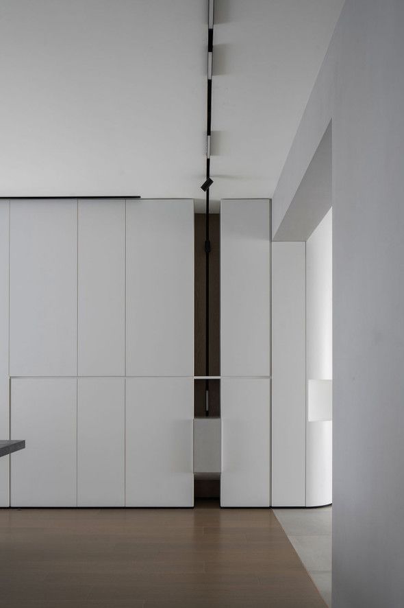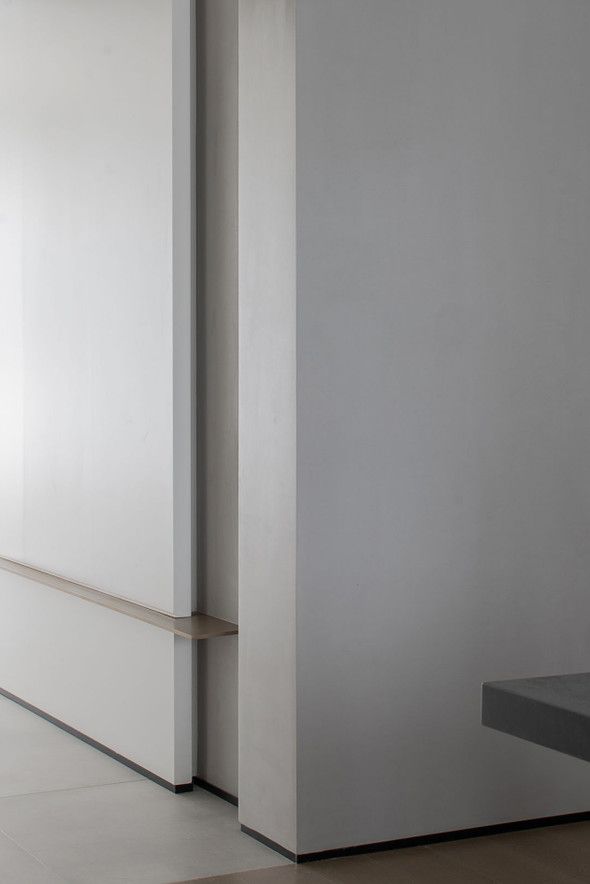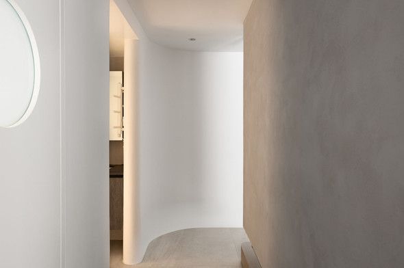 圖/東己壤設計研究室 走廊隱藏式踢腳線和弧形墻角的工藝,妥帖的處理了墻面與地面的交互。界面轉折的連貫性,讓有限的空間產(chǎn)生無限的尺度。