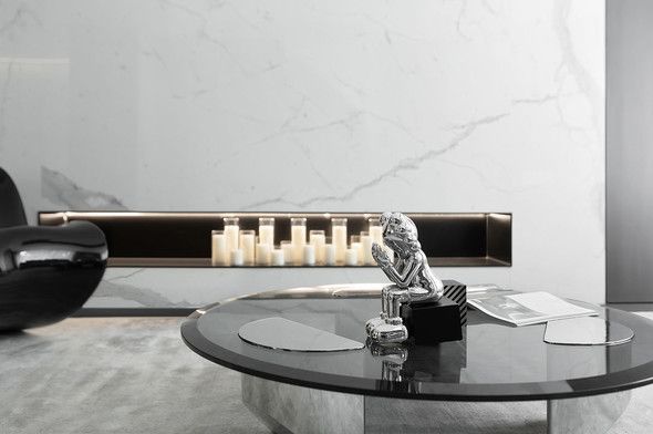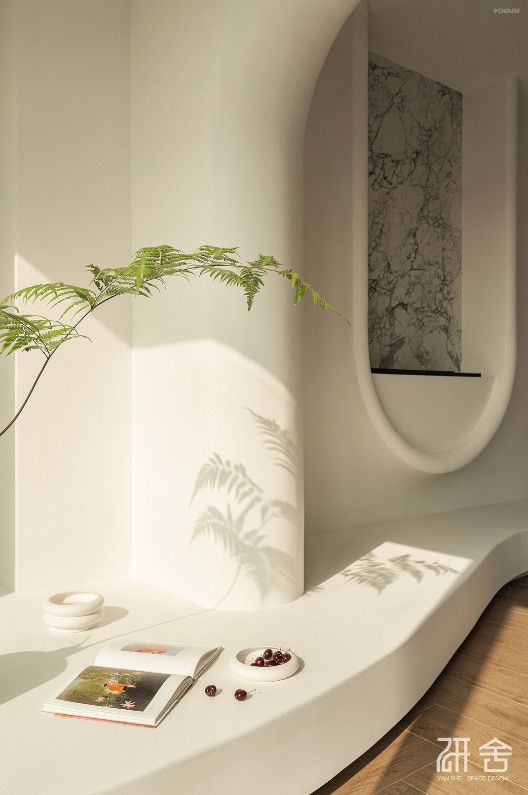 圖/研舍設計 比如以下這套90后姑娘的房子,設計師將奢華進行了精致的提取,同時保證了她的生活的極致舒適。 客廳舍棄了屋主不常用的電視,留下來是一大片自然的紋理,漂亮的理石紋路連貫并富有張力,下方的壁龕擺放的微光蠟燭,成為溫馨的一筆。