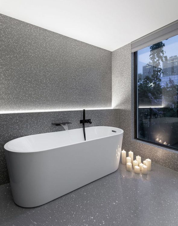 圖/柒筑空間設計有限公司 衛(wèi)浴空間大量采用水磨石材質,細膩的紋路仿佛懸浮著的星光,與其共處的其他材質平衡的剛剛好,仿佛在共曲一篇樂章。