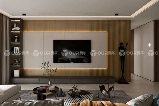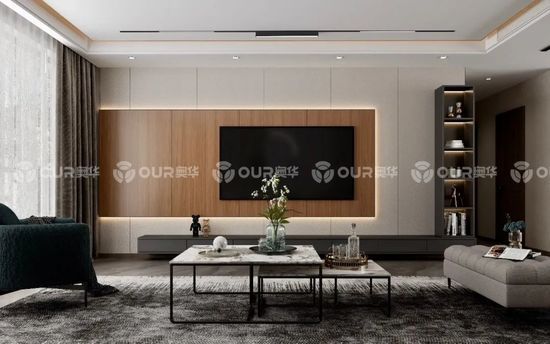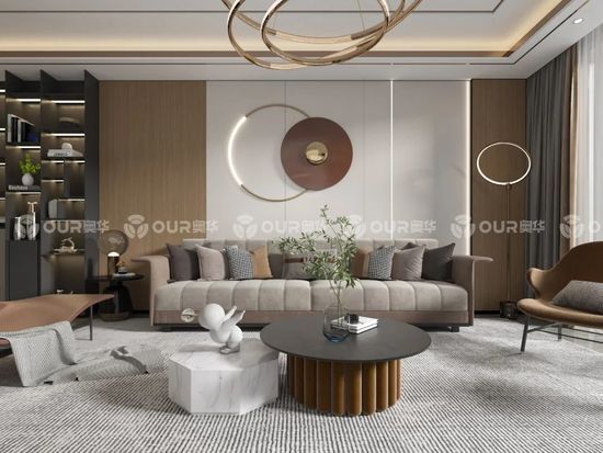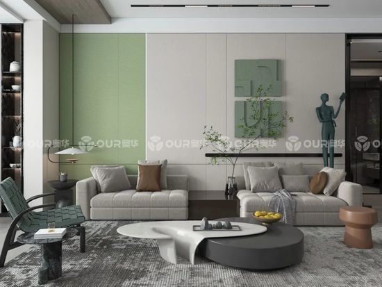 奧華松綠背景墻+布拉格皮紋,清雅的灰調(diào),在蜿蜒在綠意中,為客廳舒展出一種靜謐的高級(jí)感,用精致的細(xì)節(jié)之美,演繹美妙休閑時(shí)光,讓笑聲伴著家人回憶更多幸福時(shí)光。
