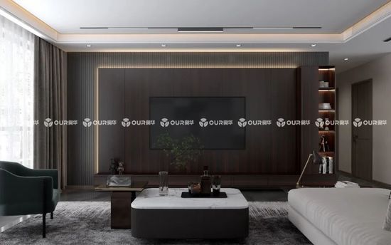 奧華黑喬木大面積運用在客廳,再加上無主燈的設計,商務精英感滿滿。辦公、休閑、娛樂等不同場景,也能輕松切換。