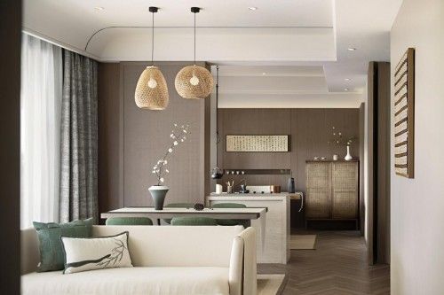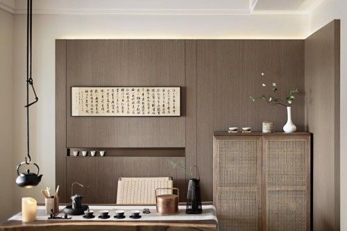 自然界的每一種現(xiàn)象,都與一種心靈狀態(tài)相呼應(yīng)。設(shè)計捕捉這份轉(zhuǎn)瞬即逝的居家感受,重新賦予空間與生活聯(lián)系。暮色之中,人的內(nèi)心不自覺進(jìn)入一種疲態(tài),這時候人需要給自己一個放松的空間,去承載和包容。設(shè)計再次營造了一個令人舒適的氛圍,讓心境回歸到一個自然寧靜的狀態(tài)。 位于端頭的茶室營造了生活的悠然,一如成都人的“關(guān)上門來,白茶清歡無別事”。借暮色煮一杯清茶,夕陽西下,各自在??蛷d、餐廳與茶室,隱藏式移門設(shè)計,在整體布局上一以貫之,讓彼此隔而未隔,界而未界,空間互為聯(lián)系。