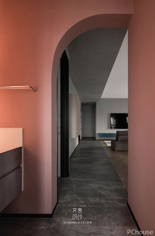 洗手間 設(shè)計師在筆直硬朗的實墻中注入了弧形線條,通過線條中和了色彩上的視覺沖擊強度,讓慢慢暈開的橙色不再突兀,反而舒適且不刺眼。 屋主:陳先生: 另外,我覺得設(shè)計師在整個家中的用色上都很考究,整體感覺非常棒。用顏色搭配質(zhì)地,將質(zhì)感與美感相結(jié)合,在餐廳處,臥室里,都有設(shè)計師的色彩巧思。