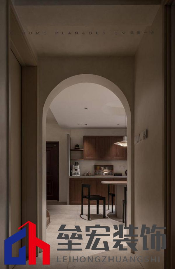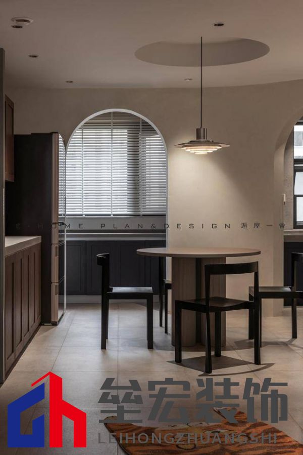 原有的廚房空間比較單一,把小陽臺納入使用之后,設計師用圓弧的切口圍合出了餐廳部分,并且實現(xiàn)了中西廚、餐邊柜的完備功能。 # 隱形收納