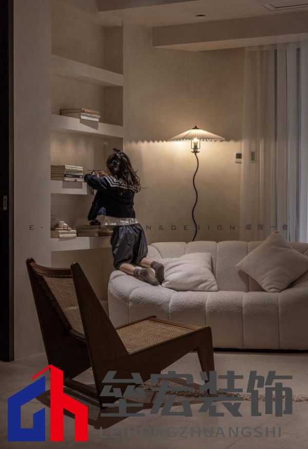 投影幕布+進門處的懸空鞋柜,一條水泥臺面貫穿其中,這就是電視背景的總和,大面積的留白,為以后斑斕的生活留下補充的余地。 在這個家里,客廳和滑梯是一種很奇妙的組合,我們看不到絕對的成人邊界,也沒有被童話故事所羈絆,設計師很好地處理了兩個世界的融合、過渡。 客廳的氛圍適合交談和放松,圓形的地毯圈出溫柔的一角,窩進云朵般蓬松的沙發(fā)里,在時光的縫隙中悠然度過。