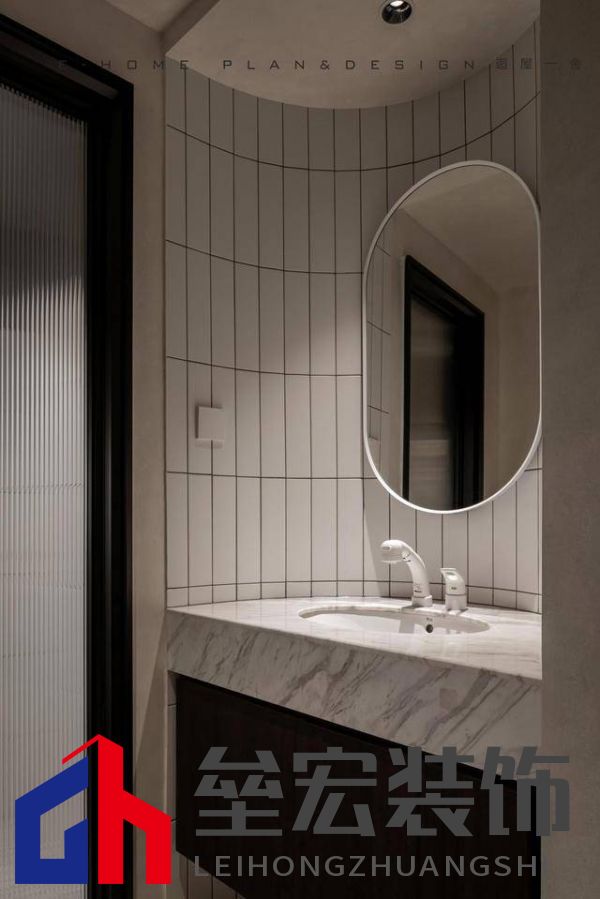 滑梯旁的洗手臺,墻面向內借用了房間的面積,潔白的小磚借用弧的張力,打造了簡潔有力的清潔區(qū)域。 從清潔區(qū)望向另一面的弧,餐廳準備好出場
