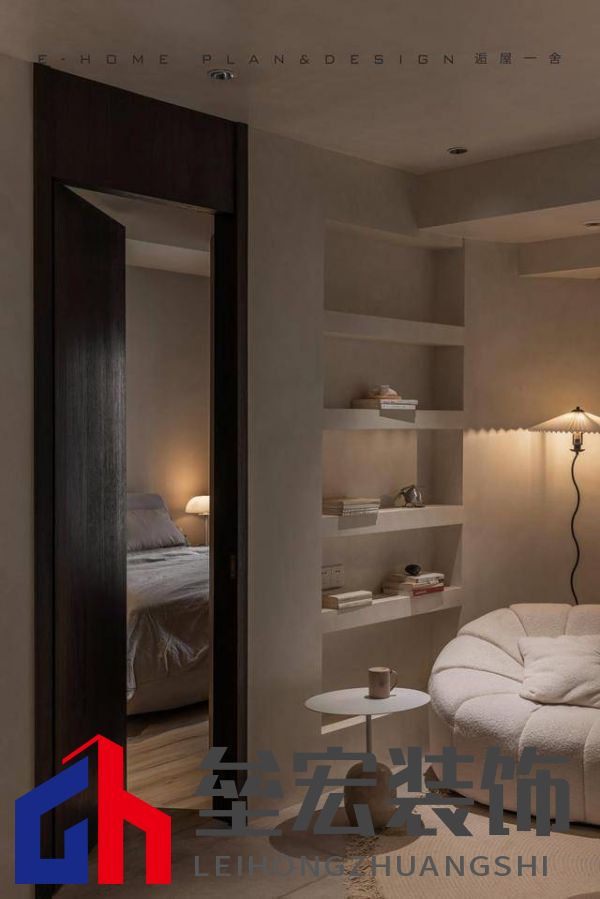 借助墻壁而做的壁龕式書架,賦予這個角落更凝聚的力量,隨手可取的物件,以及插座的布置,使這里美且使用。 無主燈設計之下,溫暖的氛圍光源將視線引向主臥的方向。