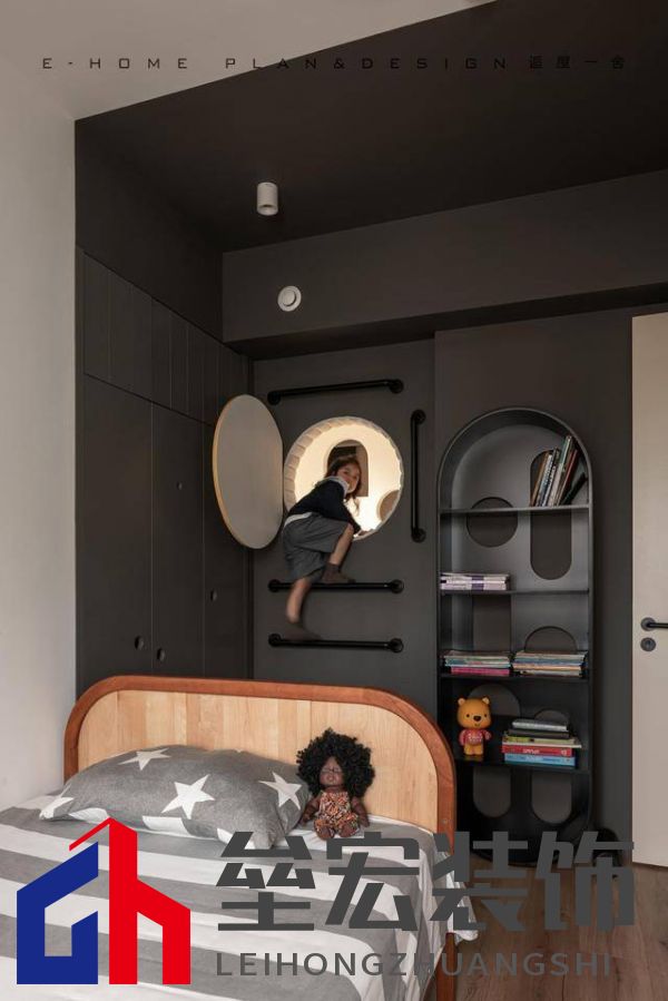 順便認識下灸哥的房間,衣柜連接著攀爬架和書架,在深邃的顏色里開一個圓口,船艙里的的小水手正要去看看外面的世界。 第2個線索: 經過被軟包修飾好的通道到達目的地