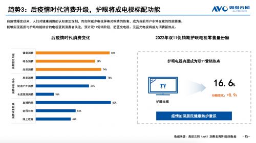 | 奧維云網(wǎng)《2022中國彩電市場“雙11”預(yù)測報(bào)告》預(yù)測,今年雙11促銷期間,護(hù)眼電視零售量份額將達(dá)到16.6%,相比去年提升8.9%,成為電視市場的營銷熱點(diǎn)。報(bào)告觀點(diǎn)基于當(dāng)下消費(fèi)者心理的變化預(yù)測而來。自疫情爆發(fā)以來,人們對健康消費(fèi)的認(rèn)知更加深刻,如何減少電視屏幕對眼睛的傷害,成為當(dāng)前用戶非常在意的性能要素。能夠?qū)崿F(xiàn)畫質(zhì)與護(hù)眼功能結(jié)合的電視受到消費(fèi)者關(guān)注,防藍(lán)光電視、無藍(lán)光電視將成為雙11家電消費(fèi)新熱點(diǎn)。
