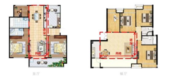 ▲奧華部分家裝案例 它到底有何魅力?遇上這種戶型又該如何裝修?今天咱就來聊聊橫廳~ 什么是橫廳 認識橫廳之前,我們先來了解兩個名詞:開間和進深。 開間:指相鄰兩個橫向定軸線間的距離。 進深:指建筑物縱深各間的長度。 我們以往接觸的常規(guī)戶型通常都是豎廳,開間<進深,采光來源于客餐廳的兩端,空間狹長。 當開間>進深,客廳與餐廳并排同面采光,空間寬敞通透,即我們說的橫廳。