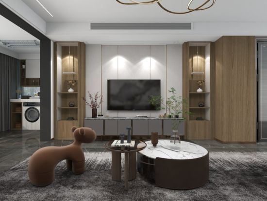沙發(fā)背景墻運用奧華石晶壁畫、黃栗柚搭配。在看似自然樸素的外表下隱藏著貴族的氣質(zhì)。