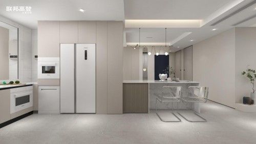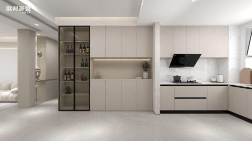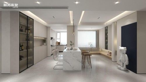 廚房為U型開放布局,打造交互動線靈活自在;現(xiàn)代吧臺將餐廚與休閑地巧妙分區(qū),輕松解鎖多功能實用空間。