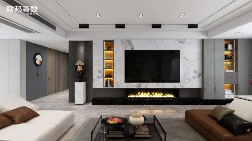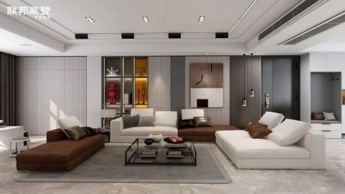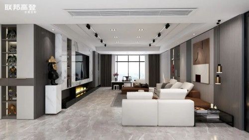 與墻同寬的挑高餐邊收納柜,配色紋理堅(jiān)守著冷峻理性,讓紳士格調(diào)盡顯;同時利用回字型設(shè)計(jì)將存儲值拉滿,為日常收納輕松減壓。 二、客廳全屋定制設(shè)計(jì) 客廳作為居家休閑、待客的重要區(qū)域,占地面積大且注意事項(xiàng)更多。合適的客廳空間設(shè)計(jì),既能提升居家幸福感,也能彰顯出屋主的個性品味。