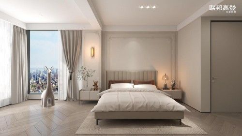 主臥遵循極簡自然的舒適氛圍,采取適當(dāng)?shù)牧舭祝柟鈴穆涞卮皳]灑而來,明朗通透又舒緩愜意。