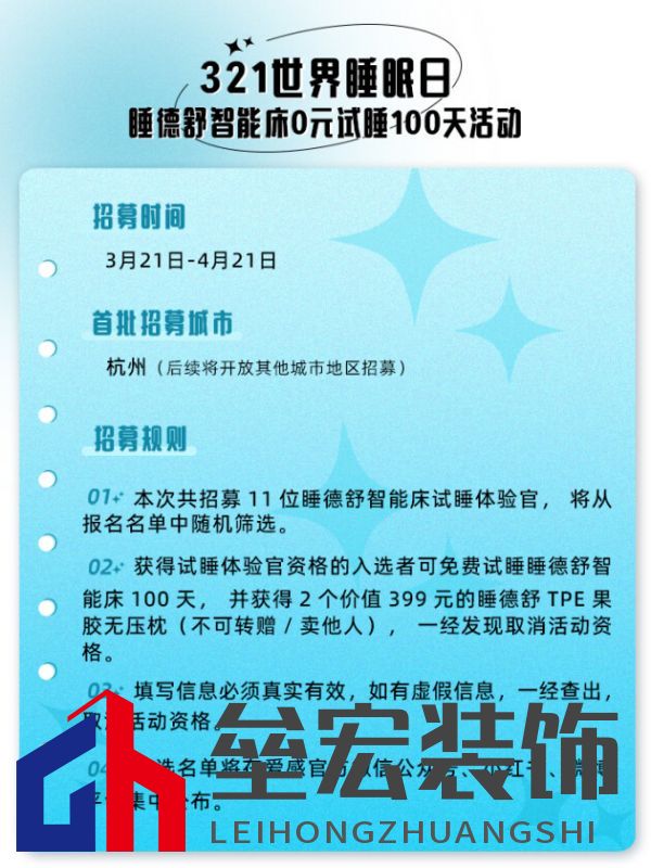 | 2023年3月21日是世界睡眠日,愛感全屋智能家居在杭州正式開啟了為期一個月的試睡官招募活動——免費體驗睡德舒智能床100天! 本次活動旨在幫助更多有睡眠障礙的朋友實現(xiàn)更快速、更健康、更高效的好睡眠,從根本上解決人們的睡眠痛點,改善人們的睡眠習慣和睡眠質量,讓大家都擁有一個健康的好身體。