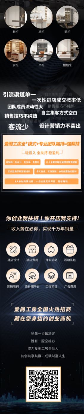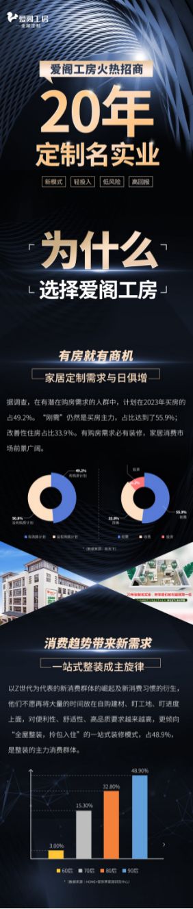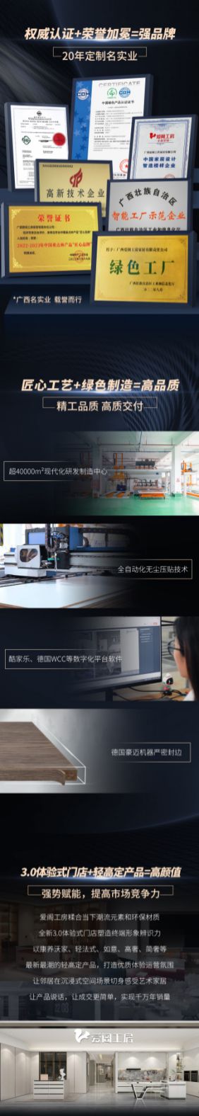 | 伴隨國內(nèi)經(jīng)濟快速發(fā)展,定制家居行業(yè)充滿變革與生機,國家高度重視工業(yè)制造業(yè)的高質(zhì)量發(fā)展,家居建材行業(yè)相關政策陸續(xù)出臺,家居消費計劃和信心迅猛提升,利好因素持續(xù)涌現(xiàn),為行業(yè)發(fā)展注入強勁活力,全新的市場爭奪之戰(zhàn)已經(jīng)打響。 愛閣工房作為20年廣西名實業(yè),集研發(fā)、設計、生產(chǎn)、銷售、服務及人才孵化為一體,研發(fā)實力強勁,擁有超40000㎡現(xiàn)代化研發(fā)制造中心,產(chǎn)品涵蓋各種風格的櫥柜、衣柜等全屋定制家具,并逐漸延伸至沙發(fā)、寢具、門窗等硬裝、軟裝配套產(chǎn)品。品牌自成立至今,始終堅持“精工品質(zhì) 高質(zhì)交付”,引進德系全套生產(chǎn)設備、自動化無塵壓貼設備,構建高質(zhì)量的智能化生產(chǎn)體系,通過酷家樂、德國WCC等數(shù)字化平臺軟件打通設計、生產(chǎn)、交付全鏈路服務體系,為及時供貨提供強有力保障,相繼榮獲高新技術企業(yè)、智能工廠示范企業(yè)、綠色工廠、中國重點林產(chǎn)品“匠心品牌”等稱號。 愛閣工房全新3.0體驗式門店糅合當下潮流元素和環(huán)保材質(zhì),以最新最潮的輕高定產(chǎn)品,打造優(yōu)質(zhì)體驗運營氛圍,讓鄰居在沉浸式空間場景切身感受藝術家居。全+模式聚焦賦能新商,專業(yè)渠道運營團隊全程扶商,8大補貼政策扶持,12:1全案終端運營服務支持,打造標桿門店,業(yè)績?nèi)嫣嵘?,實現(xiàn)1000萬+年銷量。目前愛閣工房全國火熱招商,誠邀優(yōu)秀新商加盟,攜手共創(chuàng)共享共贏,成就財富人生。商機無限,切莫錯過。