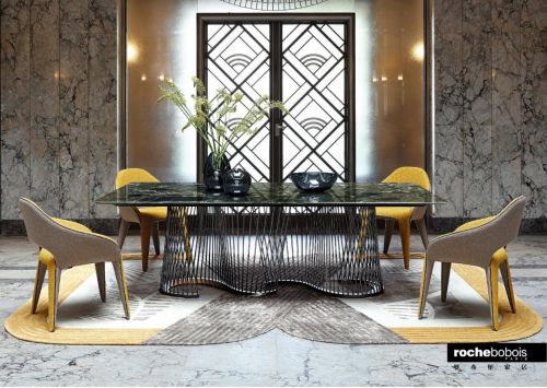 Serpentine 餐桌由設(shè)計(jì)師 Fabrice Berrux 設(shè)計(jì), 有著連綿起伏的金屬底座,是96根金屬桿組成的兩個(gè)相同且獨(dú)立的“S”形圓弧。 雖然這是一張大尺寸的桌子,但是這種獨(dú)特的設(shè)計(jì)營(yíng)造出了一種輕盈的氛圍感。 桌面是來(lái)自意大利大理石 Verde Levanto,大量的綠色摻雜些許白色。