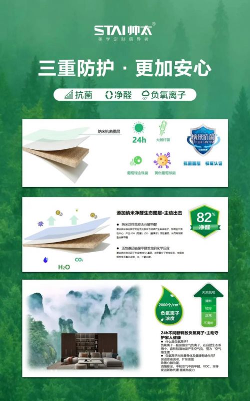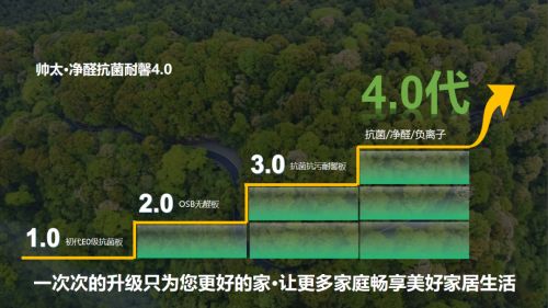 帥太品牌創(chuàng)立21載,對環(huán)保健康始終高度重視,2023年全新推出的凈醛抗菌耐馨板,打響凈醛抗菌保衛(wèi)戰(zhàn)!從環(huán)保、科技、時尚的研發(fā)理念到健康整家,從單產(chǎn)品環(huán)保到整家環(huán)保的健康維度劇變。 帥太凈醛抗菌耐馨板 引領(lǐng)家居健康革命 帥太品牌在創(chuàng)始之初就以環(huán)保、科技、時尚的產(chǎn)品研發(fā)理念,2011年帥太櫥柜推出之初,就本著為消費(fèi)者打造綠色健康的產(chǎn)品,率先在櫥柜行業(yè)中推出“抗菌板”,深受消費(fèi)者的熱捧!