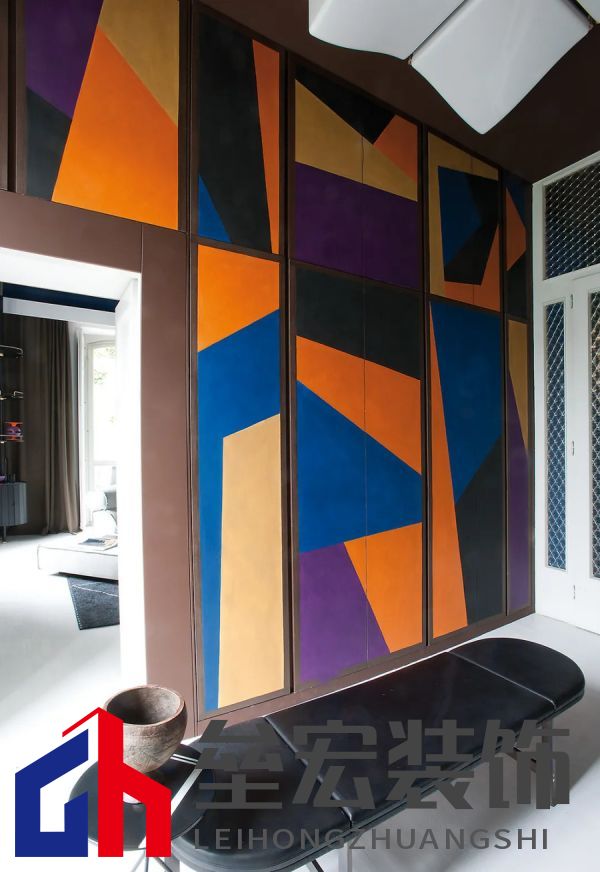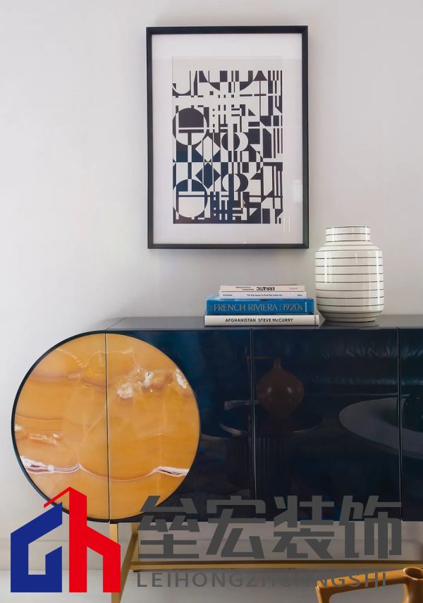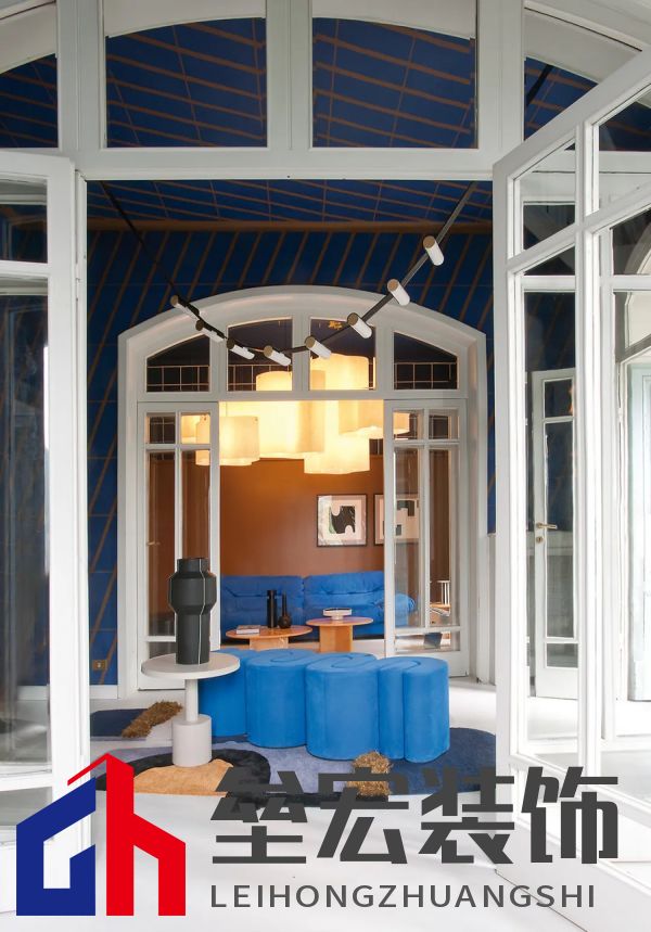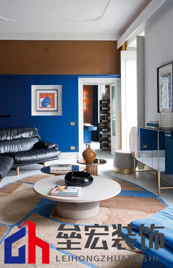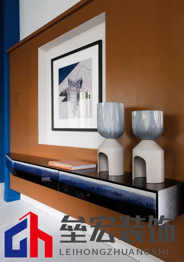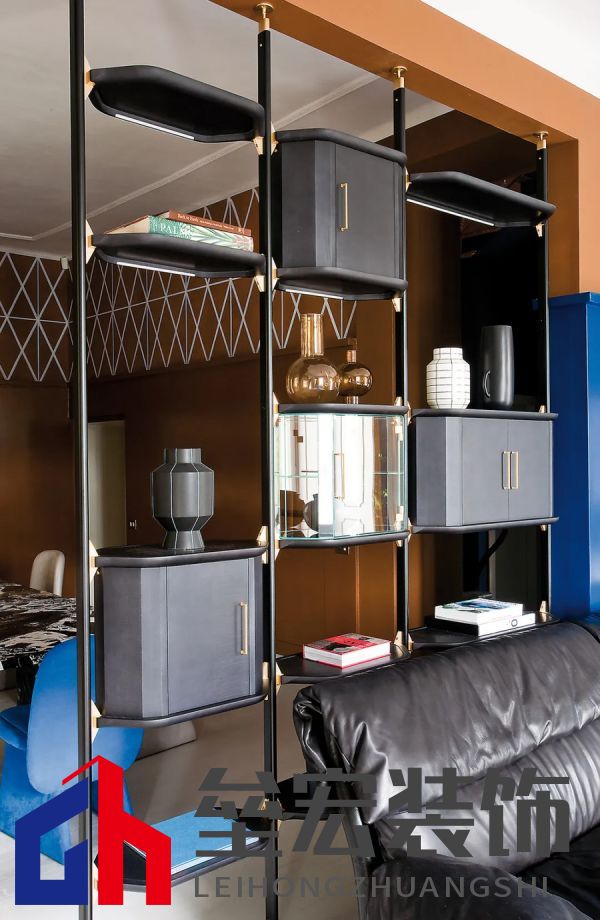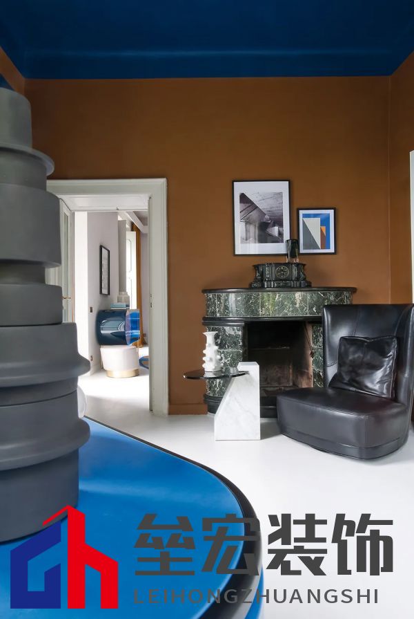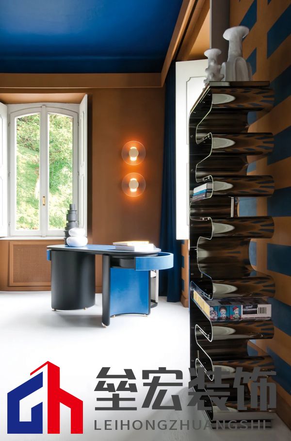 左圖:Hagit?Pincovici(Baxter?事務(wù)所)設(shè)計(jì)的?Selene?系列家具。 右圖:樹脂材質(zhì)的?Altea?置物架由?Draga&Aurel?設(shè)計(jì)(Baxter?出品)。 進(jìn)入別墅,映入眼簾的是乳白色的地板和飾有幾何圖案的手工紙墻壁。這種現(xiàn)代氛圍可能出人意料,但卻突出了對(duì)比鮮明的材質(zhì)以及為原有的皮革和飾面呈現(xiàn)出的明亮色調(diào)。在一樓,電光藍(lán)和干邑色與黑色相互交錯(cuò),疊加出圖案的感覺。特別是在門廳處,墻壁上的藍(lán)色和干邑色條紋斜向排列,在此襯托下,F(xiàn)ederico?Peri?設(shè)計(jì)的?Wave?燈具呈現(xiàn)出纖細(xì)靈動(dòng)的輪廓,顯得格外突出。
