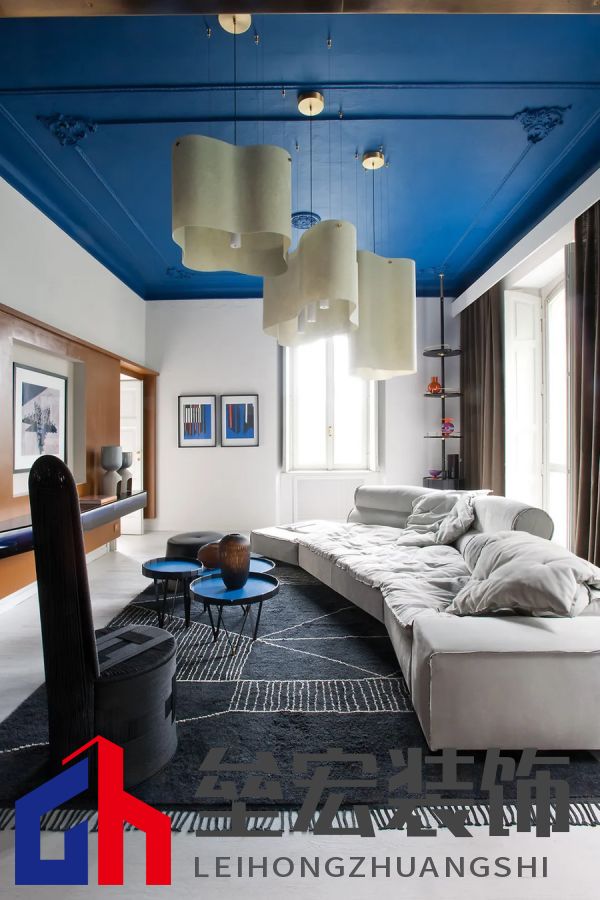 入口處的小客廳里擺放著?Adel?長(zhǎng)凳、Pilar?邊桌、Federico?Peri?設(shè)計(jì)的?Wave?吊燈、Himani?地毯。背景中的大客廳中擺放著?Paola?Navone?設(shè)計(jì)的?Milano?長(zhǎng)沙發(fā)和?Tebe?茶幾(均由?Baxter?出品)。