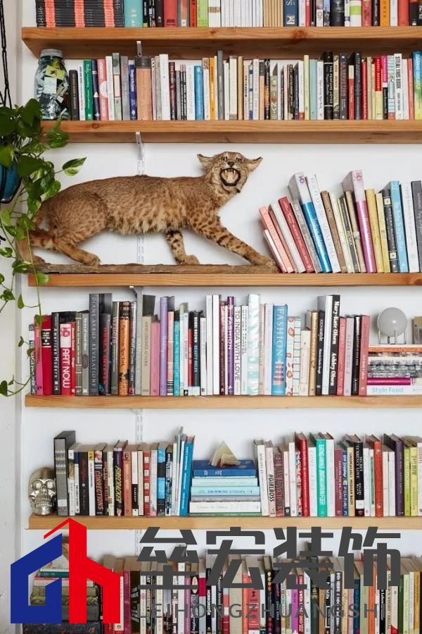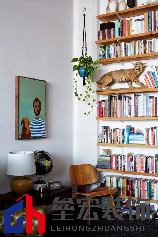 ? 02、 藝術(shù)型書(shū)空間Caroline是名雜志社編輯,她家是個(gè)改造后的閣樓。整個(gè)空間如她一樣有趣、酷炫。她熱衷于改造,就好像在一張空白畫(huà)布上創(chuàng)作?!皩?duì)我來(lái)說(shuō),一個(gè)空間永遠(yuǎn)不會(huì)完工,因?yàn)樗蔷幼≌呱畹恼鎸?shí)反映?!遍喿x角是家里的愜意所在,白日里她常以多種姿勢(shì)癱在這兒,翻動(dòng)喜歡的書(shū)籍。擱板架延續(xù)至整墻,與木質(zhì)單椅保持統(tǒng)一材質(zhì)、色系,整潔干凈且富有延續(xù)性。曾喜歡用色彩整理書(shū)籍的她,現(xiàn)在更愿意給予空間一種自在隨性的氛圍感,于是當(dāng)下的收納更偏主題性。旁邊一幅Hidir?Jiang?Tapanoglu的總統(tǒng)肖像,為這個(gè)松弛角落增添一抹別樣藝術(shù)氣息。