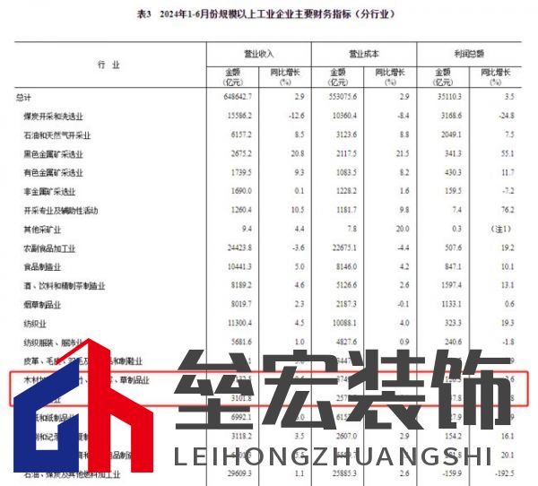| 7月27日,國家統(tǒng)計局發(fā)布2024年上半年全國規(guī)模以上工業(yè)企業(yè)運(yùn)行情況。 數(shù)據(jù)顯示,1—6月份,全國規(guī)模以上工業(yè)企業(yè)實現(xiàn)利潤總額35110.3億元,同比增長3.5%;營業(yè)收入64.86萬億元,同比增長2.9%;營業(yè)收入利潤率為5.41%,同比提高0.03個百分點(diǎn)。 分行業(yè)看,泛家居行業(yè)方面,1—6月份,全國家具制造業(yè)規(guī)模以上工業(yè)企業(yè)實現(xiàn)營業(yè)收入3101.8億元,同比增長5%;實現(xiàn)利潤總額137.8億元,同比增長3.8%。 1—6月份,全國木材加工和木、竹、藤、棕、草制品業(yè)規(guī)模以上工業(yè)企業(yè)實現(xiàn)營業(yè)收入4132.5億元,同比下降0.6%;實現(xiàn)利潤總額126.3億元,同比增長2.6%。