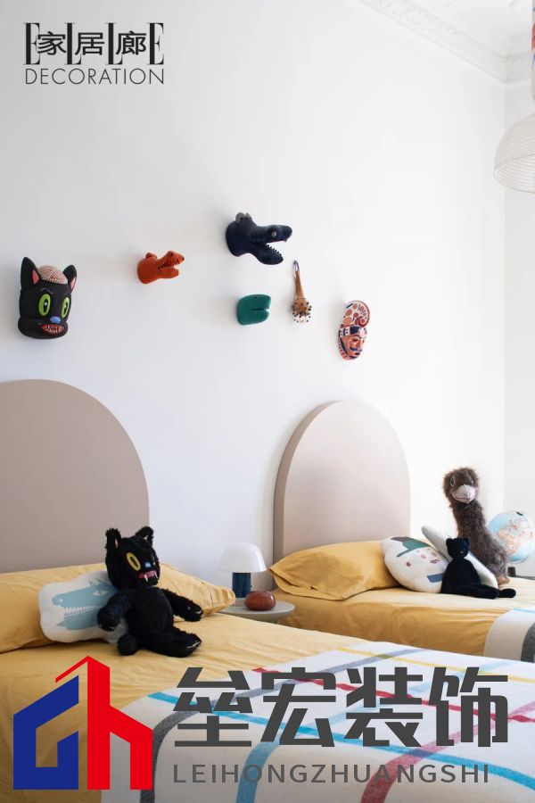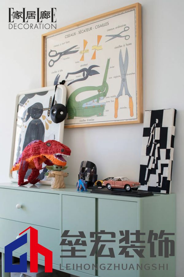 孩子們臥室的墻邊柜為定制,掛著黑色小面具的墨水簡筆畫作出自Jaime親筆,畫框是定制的。