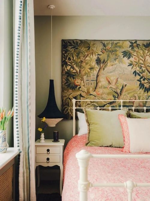定制的花朵條紋軟包和亞麻布的靠墊,讓主臥的空間變得更加雅致溫柔。