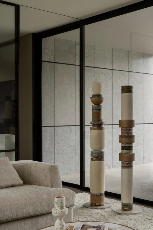 白色紗簾輕柔地遮擋窗外景色,具有朦朧美的同時,也讓整個空間更加明亮通透。窗簾上方的流線型吊燈以其簡潔的設(shè)計(jì)為空間增添了一抹藝術(shù)氣息。 于沙發(fā)旁的塔狀裝飾品,以多樣不規(guī)則的圓柱形設(shè)計(jì)拼合而成,配合米色、棕色與灰色的豐富紋理,為空間增添了層次感。金屬支架與圓形底座相呼應(yīng),彰顯了現(xiàn)代設(shè)計(jì)的簡約之美。