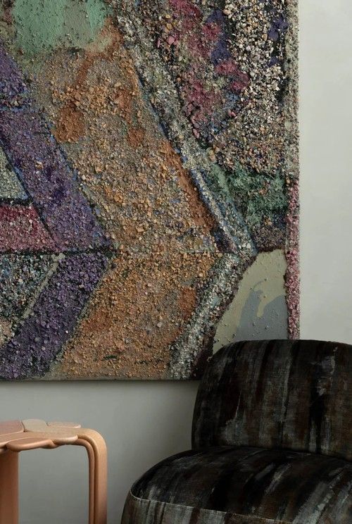 入戶口的紋理裝飾畫,以紫色、藍(lán)色、綠色和棕色的混合使用,加以粗糲的碎石營造出立體感。非對稱的不規(guī)則構(gòu)圖,給予畫作獨(dú)特的動感。與深色紋理的沙發(fā)和簡約線條感形成了和諧的呼應(yīng),共同塑造一種現(xiàn)代藝術(shù)氛圍。
