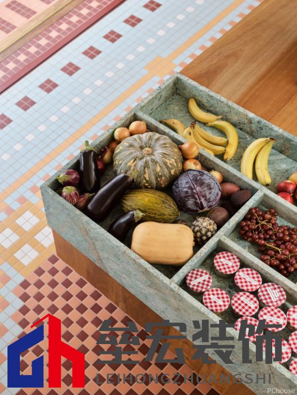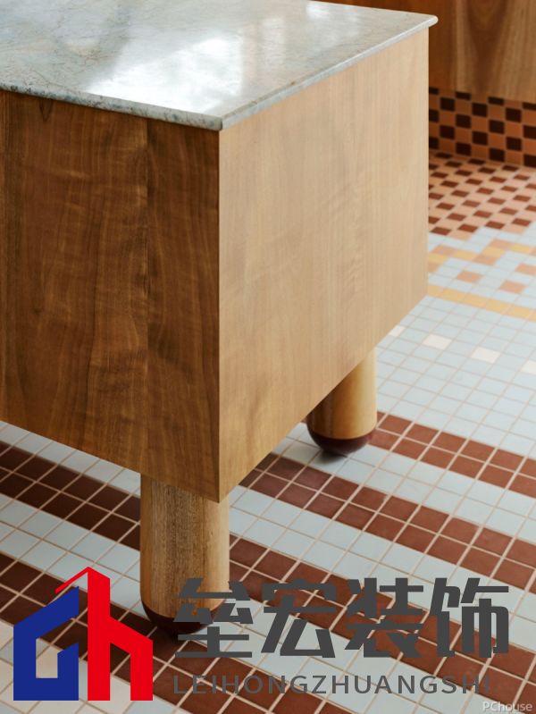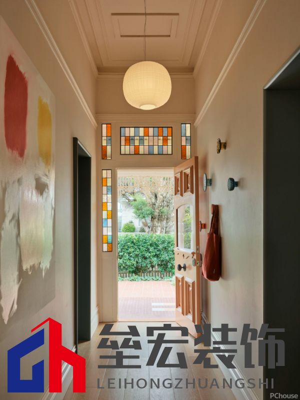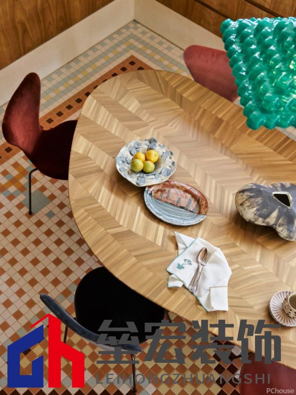 玄關(guān)是進(jìn)入住宅的第一印象,也是這所房子風(fēng)格的初步展示。入口處寶石色的鉛燈玻璃成為設(shè)計(jì)中的亮點(diǎn),賦予空間一種濃郁的異國(guó)情調(diào),并且將視覺線條引向后方擴(kuò)建部分。瓷磚圖案借鑒了波斯地毯的設(shè)計(jì),形成了一塊具有像素化效果的“地毯”,通過材料和圖案的創(chuàng)新將新舊空間連接起來,同時(shí)預(yù)示著房屋內(nèi)其他區(qū)域豐富的幾何細(xì)節(jié)。