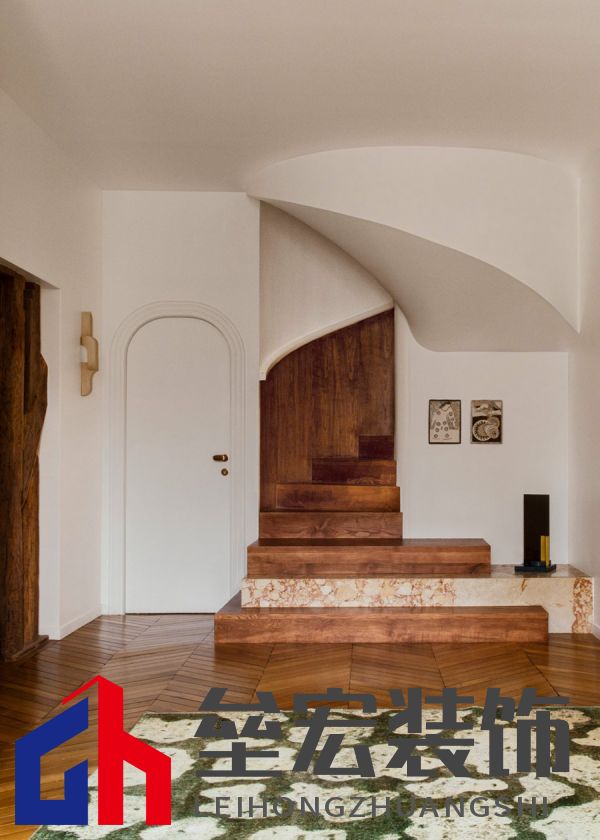 通往上層的樓梯,踏步與扶手一體,下方穿插一級(jí)石材臺(tái)階,顯得更有質(zhì)感。
