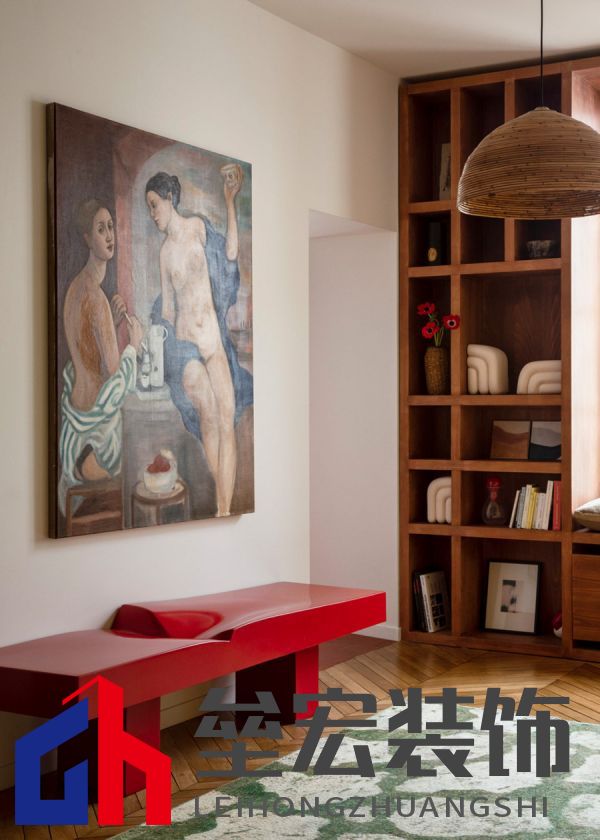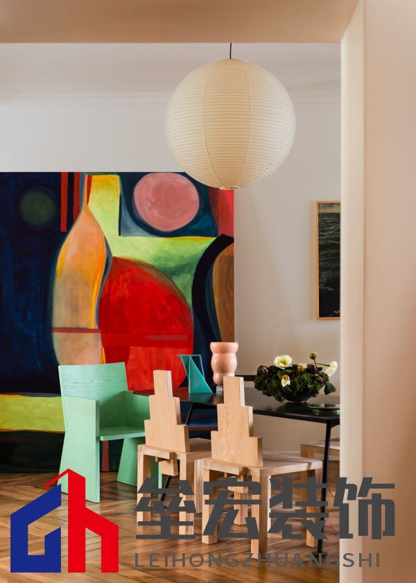 客廳融合了復(fù)古與現(xiàn)代的元素。原始的木質(zhì)地板與修復(fù)后的壁爐成為空間的亮點(diǎn),而極簡(jiǎn)風(fēng)格的沙發(fā)和幾何線條的茶幾則增添了當(dāng)代感。墻上掛著抽象藝術(shù)畫,搭配幾何形態(tài)的立體雕塑,營(yíng)造出一個(gè)適合家庭聚會(huì)又富有藝術(shù)氛圍的空間。