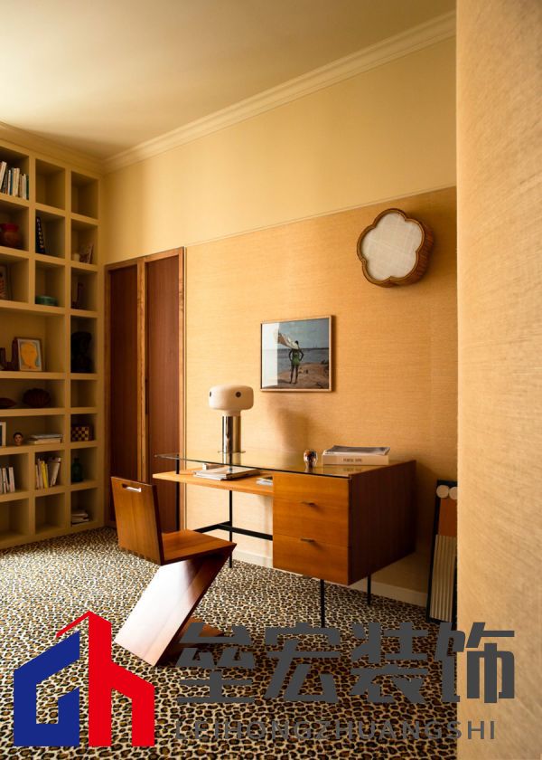書房設(shè)計(jì)簡(jiǎn)潔而高效,采用線性布局,一張極簡(jiǎn)風(fēng)格的書桌搭配人體工學(xué)椅子,滿足日常工作和學(xué)習(xí)需求。墻面安裝了大面積的定制書架,用來擺放書籍和藝術(shù)品。