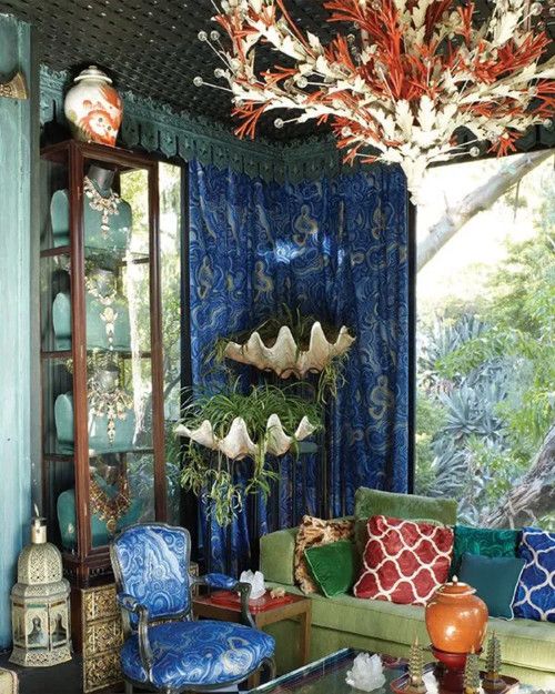 Wendy?Morrison的極繁主義之家,充滿幻想的東方元素。同時她還會在設(shè)計中考慮到風(fēng)水方面知識,用以平衡空間的自然元素。 ? 極繁主義始終在物質(zhì)與精神的拉鋸戰(zhàn)中尋找平衡點。但設(shè)計中的繁復(fù)之美,絕非沒有章法的物質(zhì)堆砌,看似元素間撕扯拉鋸,可是暗藏邏輯在其中。 美學(xué)歷程螺旋上升,家的美學(xué)也一樣,所謂的節(jié)制與放縱永恒辯證,此刻不是永恒,但此刻的感受卻可以永恒存在。 極繁主義被重新“愛上”也許是因為寡淡久了希望換種風(fēng)格,也或許真的是厭惡了所謂的條框與冰冷的舒服,想要尋找真正的自我。 極繁主義強調(diào)“大膽、豐富、層次感”,通過色彩、圖案、材質(zhì)和裝飾品的疊加,打造充滿個性與視覺張力的空間。 但極繁主義不是毫無頭緒的,無論多豐富的空間里,依舊是能在其中找到視覺核心,其他的存在皆是圍繞而而生的,而在混搭中的調(diào)性上的一致,也是保證more?is?more能夠真的實現(xiàn)美的關(guān)鍵,你會發(fā)現(xiàn)暗藏在其中的主線,些許的留白,更是那神來之筆。 01° 出挑的色彩 豐富、層次、點睛 說起極繁人們80%都會先想到色彩,或許是高飽和度的,也可能是對比強烈的色彩組合,如寶石藍(lán)、祖母綠、深紅、亮黃等,多種撞色也經(jīng)常會出現(xiàn)。 我們還可以看到在墻面、家具、軟裝的色彩疊加,產(chǎn)生豐富的視覺層次感,也有在基礎(chǔ)色調(diào)中加入小面積跳色來制造視覺焦點。