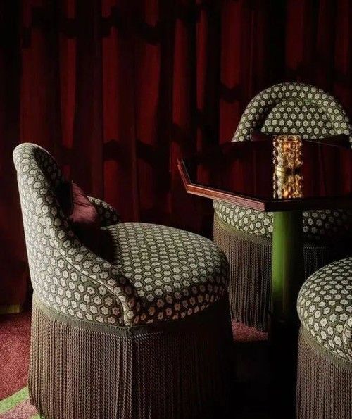 ?Martin?Brudnizki 02° 戲劇的沖突 那些看似不合理的“碰撞” 花卉、幾何、動物紋、復(fù)古印花等不同圖案混搭,無論是條紋墻紙搭配波西米亞地毯,或格紋沙發(fā)與熱帶植物壁畫結(jié)合。 天鵝絨、絲綢、金屬、藤編、大理石等不同材質(zhì)的碰撞,增強空間質(zhì)感,絲絨沙發(fā)搭配黃銅茶幾,或木質(zhì)書架與鏡面裝飾結(jié)合,材質(zhì)間的沖突感。很多時候還會看到繁復(fù)的壁紙、壁畫或裝飾線條(如護墻板、石膏線)打造“視覺轟炸”效果。 ?
