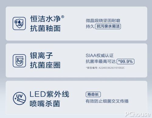 ? 恒潔水凈?抗菌釉面 微晶煅燒堅(jiān)固耐磨,持久抗污 親水性強(qiáng),輕松潔凈無殘留 銀離子抗菌座圈 SIAA權(quán)威認(rèn)證 抗菌率最高可達(dá)99.9% 多人共用也安心 LED紫外線噴嘴殺菌 壽命長 有效防止細(xì)菌交叉?zhèn)鞑?/p>