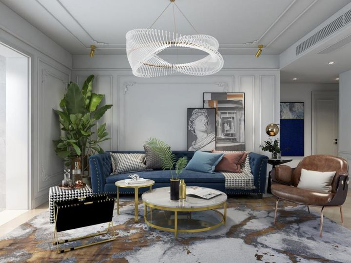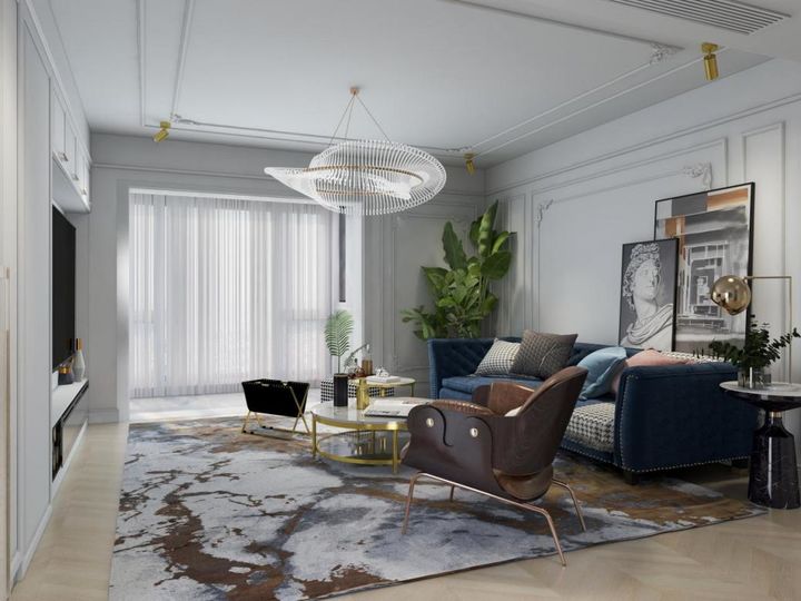 這套案例中設(shè)計(jì)師大量融入了法式風(fēng)格的設(shè)計(jì)元素,沙發(fā)背景墻的雕花線(xiàn)條,配上黃銅水晶吊頂燈的映襯,奢華大理石花紋地毯與深色皮質(zhì)沙發(fā)的搭配,共同營(yíng)造出復(fù)古且充滿(mǎn)韻味的空間。