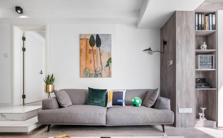 客廳主打簡(jiǎn)約的木質(zhì)風(fēng),頂天立地的收納柜,放置書(shū)籍與藝術(shù)裝飾品。墻面除了一幅靈動(dòng)的藝術(shù)畫(huà),不再施加粉黛,塑造出一種干凈、清爽的視覺(jué)感受。