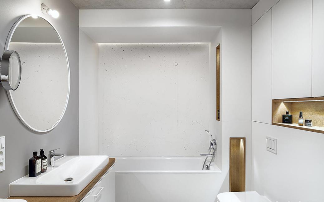 白色和淺灰色的搭配使得整個(gè)空間風(fēng)格分明又相互協(xié)調(diào),給人一種和諧質(zhì)感。白色基調(diào)下,加入金色元素,圓形鏡面相比方形更顯精致,也更為適合整體風(fēng)格。