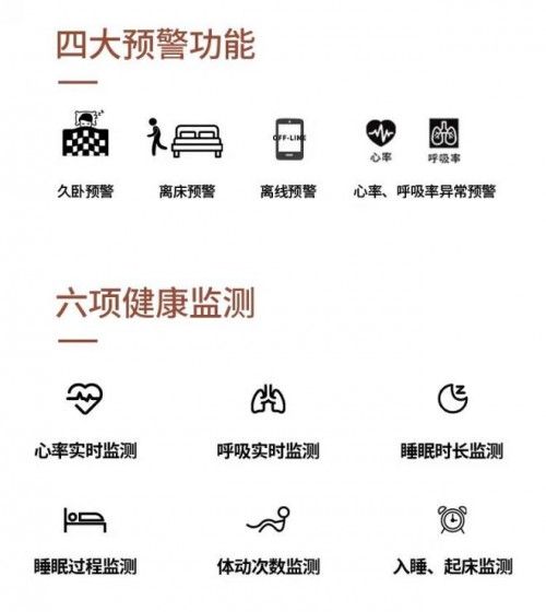 ??360°呵護(hù)模式:四大預(yù)警、六大健康監(jiān)測(cè) ??誼瑞“菁選-破曉”智能真皮電動(dòng)床,不單是讓你睡得快,睡得好,更加能讓你睡得安全,特別是老年人和長(zhǎng)期因?yàn)閴毫喗】档闹心耆巳?,睡眠時(shí)間長(zhǎng),如何能夠清晰明了的知道自己夜晚的各項(xiàng)健康指數(shù)成了急需解決的問(wèn)題,誼瑞“菁選-破曉”智能真皮電動(dòng)床采用整晚360°監(jiān)測(cè)體系,確保睡眠安全: