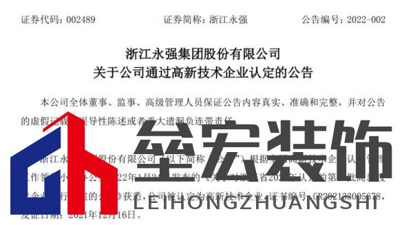《高新技術(shù)企業(yè)證書》基本情況: 1、證書編號:GR202133007210 2、發(fā)證日期:2021年12月16日 3、有效期:3年 對公司的影響: 公司已于2019年被認定為高新技術(shù)企業(yè),本次系公司原高新技術(shù)企業(yè)證書有效期滿后進行的重新認定。根據(jù)《中華人民共和國企業(yè)所得稅法》及國家對高新技術(shù)企業(yè)稅收優(yōu)惠的相關規(guī)定,公司自本次獲得高新技術(shù)企業(yè)證書認定后連續(xù)三年內(nèi)(即2021年度至2023年度),將享受國家關于高新技術(shù)企業(yè)的相關優(yōu)惠政策,按15%的稅率繳納企業(yè)所得稅。 三、浙江永強: