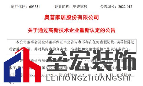 《高新技術(shù)企業(yè)證書》基本情況: 1、證書編號:GR202133002641 2、發(fā)證日期:2021年12月16日 3、有效期:3年 對公司的影響: 本次高新技術(shù)企業(yè)的認定系公司原證書有效期滿后的重新認定。根據(jù)《中華人民共和國企業(yè)所得稅法》及國家對高新技術(shù)企業(yè)的相關稅收規(guī)定,公司自本次通過高新技術(shù)企業(yè)認定后連續(xù)三年(即2021年至2023年)繼續(xù)享受高新技術(shù)企業(yè)的相關稅收優(yōu)惠政策,按照15%的所得稅率繳納企業(yè)所得稅。 二、奧普家居: 1月27日,奧普發(fā)布《關于通過高新技術(shù)企業(yè)重新認定的公告》。