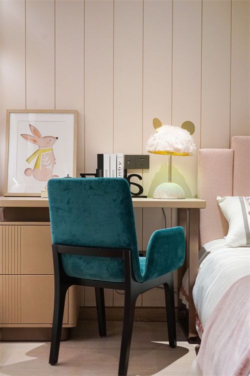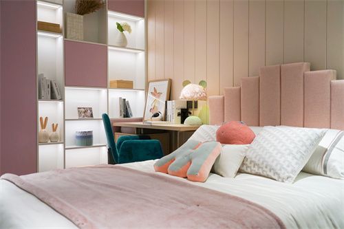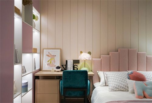 ??女/兒/房/ ??女孩房,淺粉色與原木色搭配,加上毛絨元素的點(diǎn)綴,創(chuàng)造出一個(gè)甜美溫馨的臥室空間。臥室內(nèi)設(shè)計(jì)有學(xué)習(xí)區(qū)以及獨(dú)立的衣帽空間,給孩子提供獨(dú)立專屬空間,旨在于從小培養(yǎng)孩子的獨(dú)立意識(shí)。