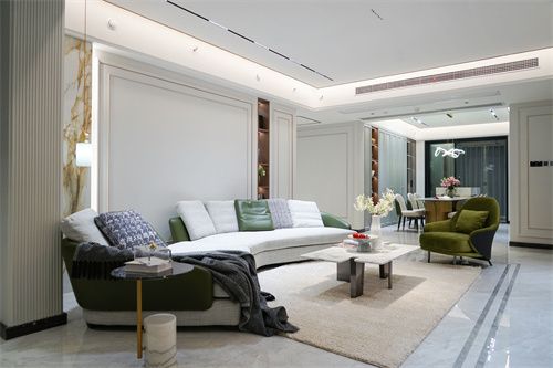 ??客/廳/ ??客廳,以米白+抹茶綠作為色彩基調(diào),清透瑩潤的大理石地面與石膏線背景墻,維系空間平衡。無主燈設(shè)計(jì),極簡吊頂內(nèi)嵌燈具見光不見燈,層疊光影,溫馨柔和。這一方空間承載家人的生活日常,在平凡與陪伴中,充滿溫情與歡樂。