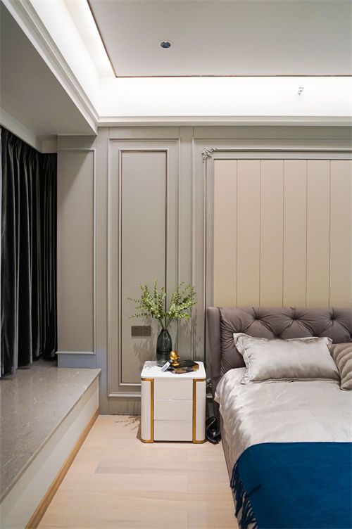 ??主/臥/ ??主臥選擇無主燈設(shè)計(jì),淺灰色石膏線背景墻,硬朗的線條與隱形衣柜相互交融,散發(fā)出沉穩(wěn)內(nèi)斂的空間氣息。作為套房,包含衣帽間和衛(wèi)生間,以流暢簡約的動(dòng)線滿足居住需求。