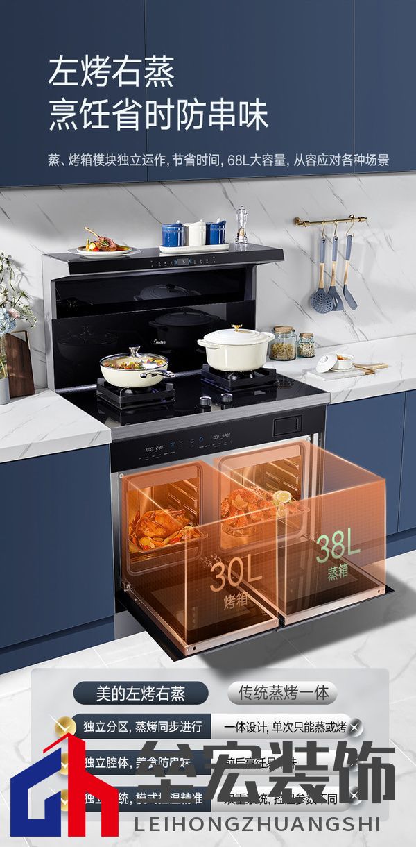 在千篇一律中尋找突破,在解決方案中覓得最優(yōu)。美的新品LS5則另辟蹊徑,首次采用頂側(cè)雙吸煙口設(shè)計,9+1黃金吸力分配,形成隱形油煙隔離倉,側(cè)面吸煙口率先吸走90%的油煙,頂部吸煙口再吸走10%的殘留逃逸油煙。 “上攏吸,下近吸”,黃金25-40CM低空近吸油煙+900MM寬域進(jìn)煙距離,再配合21m3/min的極速大風(fēng)量,讓油煙剛產(chǎn)生的瞬間就被阻隔和吸走,油煙吸凈率接近100%,真正做到源頭阻擊,油煙不逃逸。 第二招:雙腔蒸烤高效率的烹飪體驗 中國人廚房普遍偏小,所以集成灶的集成屬性發(fā)揮了多種電器“合體”的功效。這也讓蒸烤一體集成灶逐漸流行。 但是從一些消費(fèi)者反饋的信息來看,蒸烤一體集成灶由于共用一個腔體,既要承擔(dān)蒸箱的勞動,還要盡到烤箱的義務(wù),容易造成食物串味,味道跑錯“片場”;此外,因為不同食材對于加熱功率的特殊要求,蒸烤一體集成灶烹飪效率相對更低,倘若需要較短時間內(nèi)完成多道蒸烤菜肴的烹制,有些菜就只能“排隊等待”。