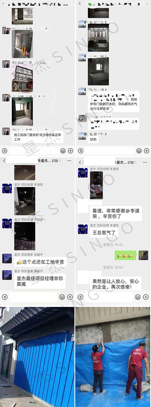 ??2021年7月,強臺風“煙花”登陸前一周,為確保每位客戶家的安全,星杰工地現(xiàn)場積極開展臺風防御措施,為客戶新家筑牢“安全結界”。 ??臺風登陸時,星杰每個工地現(xiàn)場負責人都要現(xiàn)場巡檢,實地拍照,還有相應人員在工地值守,以防突發(fā)事件。