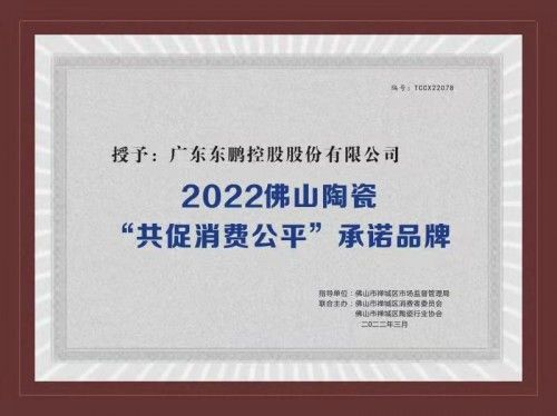 3月15日,為大力宣傳綠色產(chǎn)品(陶瓷)認(rèn)證政策,推動(dòng)我市綠色產(chǎn)品發(fā)展,由佛山市市場(chǎng)監(jiān)督管理局主辦,佛山市禪城區(qū)陶瓷行業(yè)協(xié)會(huì)協(xié)辦的“2022年佛山綠色產(chǎn)品(陶瓷)認(rèn)證政策宣貫會(huì)及“共促消費(fèi)公平”會(huì)議,東鵬控股榮獲2022佛山陶瓷百家“共促消費(fèi)公平”承諾品牌授牌。