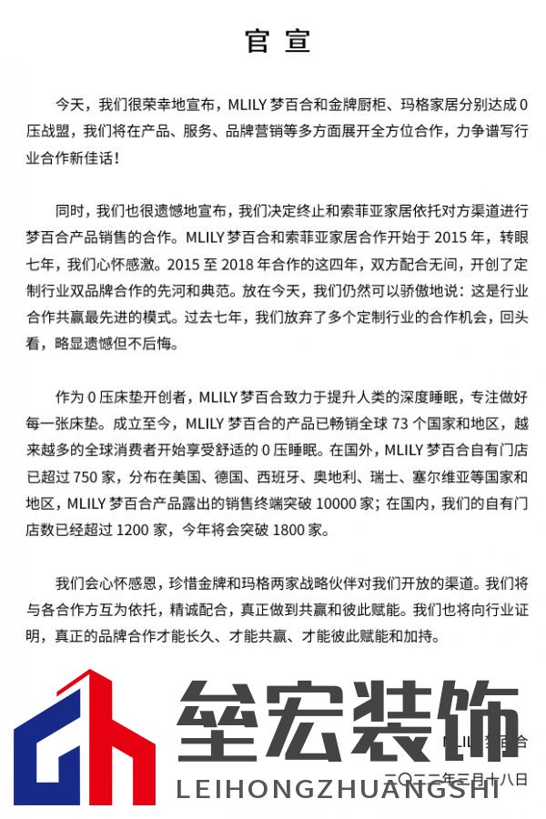 家居企業(yè)促進(jìn)家居行業(yè)消費(fèi)公平,有很多維度和發(fā)力點(diǎn),比如,運(yùn)用科技的力量變革家居家裝,同時(shí)用向善的企業(yè)文化引導(dǎo)科技向善而行;比如,不忘初心,在綠色環(huán)保低碳上下功夫;比如,讓更廣大的消費(fèi)群體享受到更高品質(zhì)的產(chǎn)品和服務(wù)等等。3月15日,國(guó)際消費(fèi)者權(quán)益日到來(lái)之際,由搜狐焦點(diǎn)家居主辦的以“共促家居消費(fèi)公平”為主題的對(duì)話沙龍舉辦,北上廣三地、聚焦三大議題、九位行業(yè)大咖進(jìn)行連線,共同探討如何有效解決家居行業(yè)“頑疾”,給消費(fèi)者吃顆“定心丸”?!贰贰伏c(diǎn)擊進(jìn)入詳情頁(yè) 05 《住宅室內(nèi)裝飾裝修工程施工驗(yàn)收規(guī)范》 團(tuán)體標(biāo)準(zhǔn)正式發(fā)布 3月14日,天津市消費(fèi)者協(xié)會(huì)會(huì)同天津市室內(nèi)裝飾協(xié)會(huì)、天津市家居商會(huì)聯(lián)合發(fā)布《住宅室內(nèi)裝飾裝修工程施工驗(yàn)收規(guī)范》團(tuán)體標(biāo)準(zhǔn),該標(biāo)準(zhǔn)將為規(guī)范住宅室內(nèi)裝飾裝修工程施工質(zhì)量與驗(yàn)收提供參考依據(jù)。 據(jù)悉,為了進(jìn)一步規(guī)范住宅裝飾裝修企業(yè)經(jīng)營(yíng)行為、加強(qiáng)行業(yè)自律、維護(hù)消費(fèi)者合法權(quán)益,天津市消費(fèi)者協(xié)會(huì)、天津市家居商會(huì)、天津市室內(nèi)裝飾協(xié)會(huì)共同提出,天津陽(yáng)光力天裝飾科技集團(tuán)有限公司、天津業(yè)之峰裝飾有限公司等31家企業(yè)共同參與制定了《住宅室內(nèi)裝飾裝修工程施工驗(yàn)收規(guī)范》團(tuán)體標(biāo)準(zhǔn)。 06 三天8省超30家陶企漲價(jià)! 江西湖南湖北河南河北云南安徽…… 據(jù)《陶瓷信息》不完全統(tǒng)計(jì),3月10-3月12日,短短三天時(shí)間,江西、湖南、湖北、河南、河北、云南、安徽、廣東等省份超過(guò)30家陶企的瓷磚/陶瓦漲價(jià)函從微信朋友圈流出,漲價(jià)品類涵蓋仿古磚、拋光磚、拋釉磚、瓷片等,漲幅普遍達(dá)到1~2元/㎡。今年開(kāi)年至3月9日期間,盡管原材料價(jià)格不斷上漲,但大部分產(chǎn)區(qū)及陶企瓷磚價(jià)格較為穩(wěn)定,僅有廣東、四川等使用天然氣的陶瓷產(chǎn)區(qū)部分陶企的產(chǎn)品價(jià)格有上調(diào)。 不過(guò),3月10日以后,發(fā)出漲價(jià)通知的陶瓷企業(yè)明顯增多。據(jù)了解,此次漲價(jià)主要與上周煤炭到廠價(jià)突然大漲有關(guān),漲價(jià)陶企使用的燃料基本以煤炭為主。 07 夢(mèng)百合與金牌廚柜、瑪格家居 達(dá)成0壓戰(zhàn)盟 終止與索菲亞的合作 2022年3月18日,MLILY夢(mèng)百合發(fā)布公告,官宣和金牌廚柜、瑪格家居分別達(dá)成0壓戰(zhàn)盟,將在產(chǎn)品、服務(wù)、品牌營(yíng)銷(xiāo)等多方面展開(kāi)全方位合作;同時(shí),遺憾宣布終止和索菲亞家居依托對(duì)方渠道進(jìn)行夢(mèng)百合產(chǎn)品銷(xiāo)售的合作。